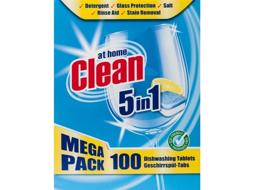 Tablety do myčky AT HOME CLEAN 5v1 jsou určeny pro všechny druhy nádobí. Tablety obsahují mycí prostředek, ochranu skla, sůl, leštidlo a účinné odstraňovače skvrn. Nádobí je po každém mytí zářivé a čisté,