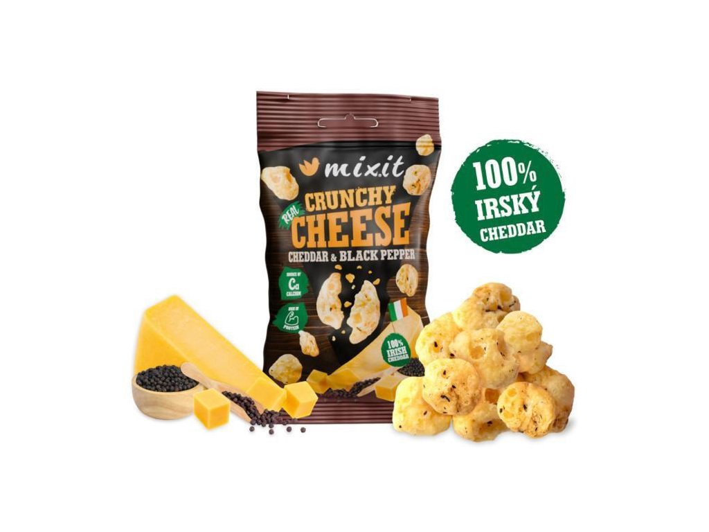 Irské sýry pravidelně vyhrávají ceny na mezinárodních soutěžích a tenhle křupavý irský cheddar u nás zvítězil na plné čáře! Irsko má ideální podmínky pro chov krav díky svým nekonečným zeleným pastvinám. Vzali jsme tedy kvalitní irský cheddar s jeho specifickou plnou chutí, šetrně jej usušili speciálním procesem a přidali drcený černý pepř. Kolik? Přece tak akorát, aby to bylo jemně pikantní, ale stále vynikla chuť sýru. Výsledkem je extra křupavý snack do kapsy plný bílkovin a vápníku. Neobsahuje nic jiného než irský cheddar a černý pepř, je tedy bez přidaných umělých látek a navíc přirozeně bezlepkový. Praktické balení se vejde do kapsy, takže si svou svačinku můžete dopřát na cestách nebo po návštěvě fitka.
